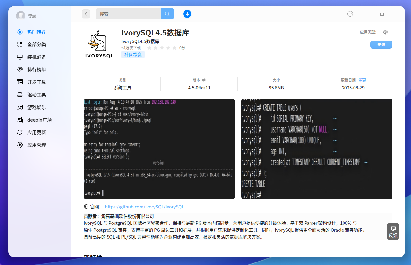 近日,IvorySQL 与 deepin 操作系统成功完成了兼容性适配认证。这一里程碑式的成就标志着 IvorySQL 在国产操作系统生态中的进一步深化,为用户提供更稳定、高效的数据库解决方案。